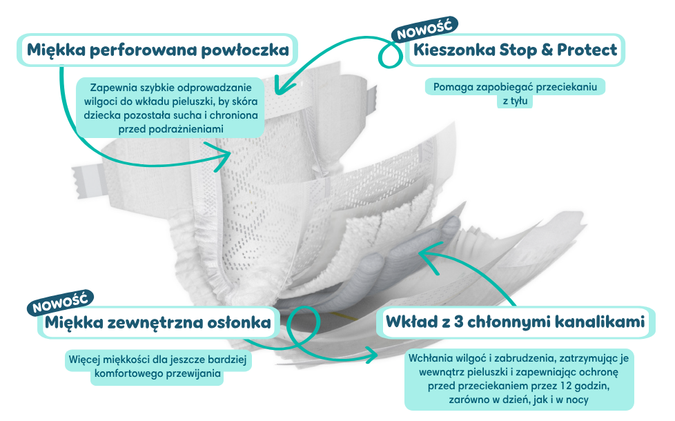 Zaprojektowane, by zapewnić pieluszkom optymalną ochronę poprzez idealne połączenie elastyczności, wytrzymałości i porowatości.