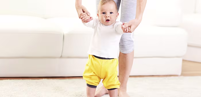 Może wyciągać się, aby stanąć przy meblach lub w łóżeczku.